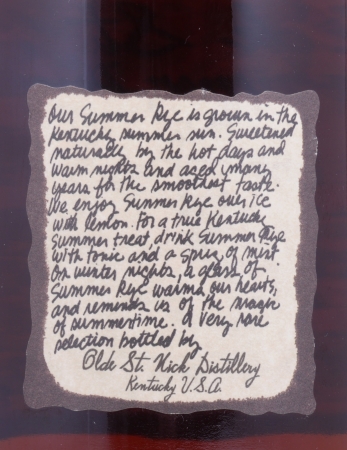 Einer der wenigen heute noch existenten alten Abfüllungen von dieser außergewöhnlichen Serie von exquisiten alten Bourbon- und Rye-Whiskeys aus der Olde St. Nick Distillery in Bardstown, der vermutlich in den späten 1980er Jahren von Willett bzw. Kentucky Bourbon Distillers in der Stitzel-Weller Destillerie Lawrenceburg oder der alten Heaven Hill Destillerie produziert wurde.