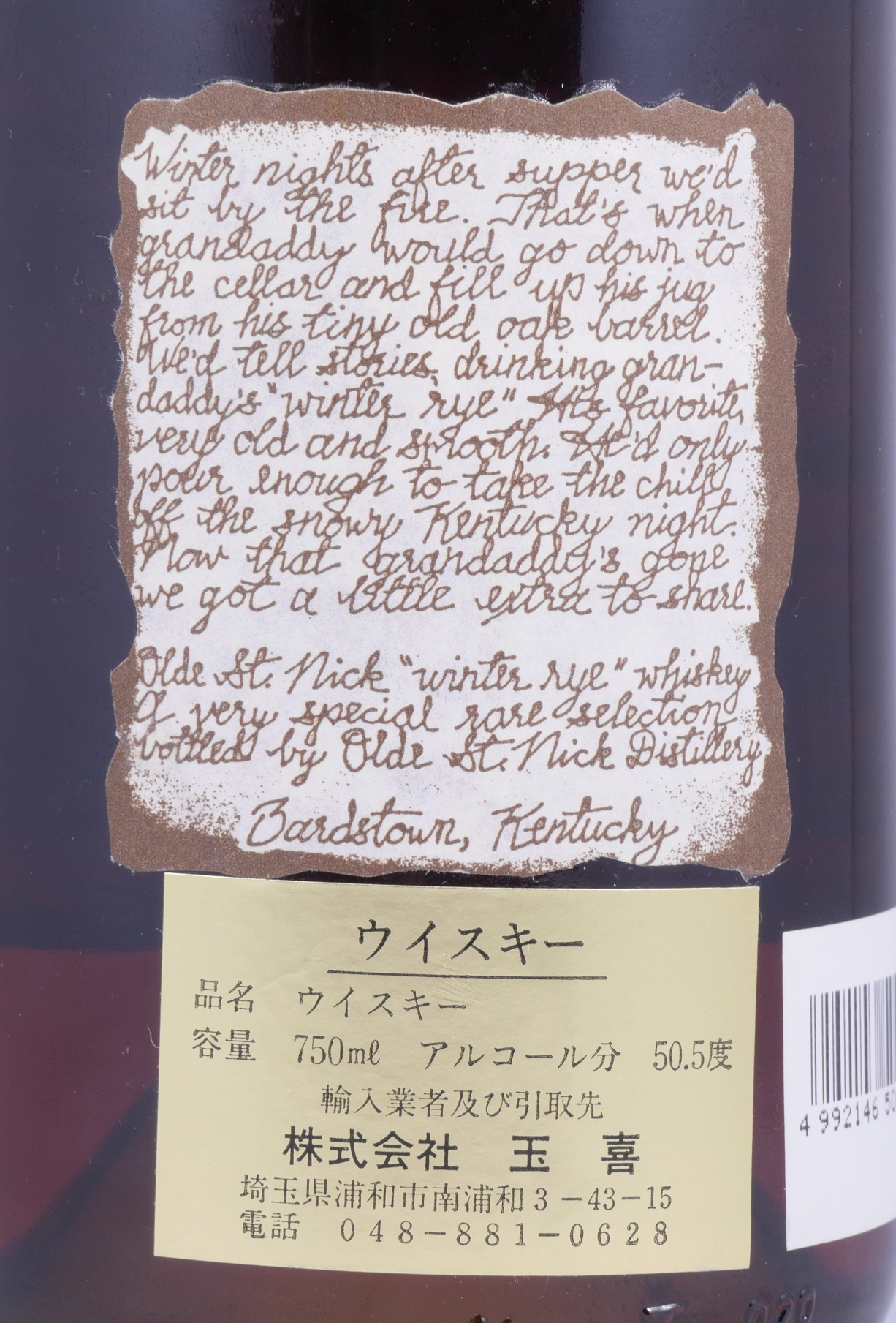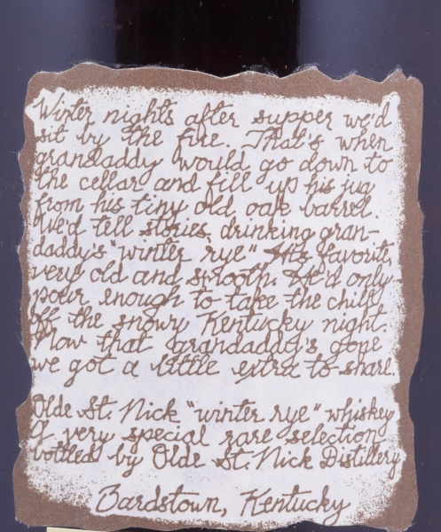 Einer der wenigen heute noch existenten alten Abfüllungen von dieser außergewöhnlichen Serie von exquisiten alten Bourbon- und Rye-Whiskeys aus der Olde St. Nick Distillery in Bardstown, der vermutlich in den späten 1980er Jahren von Willett bzw. Kentucky Bourbon Distillers in der Stitzel-Weller Destillerie Lawrenceburg oder der alten Heaven Hill Destillerie produziert wurde.