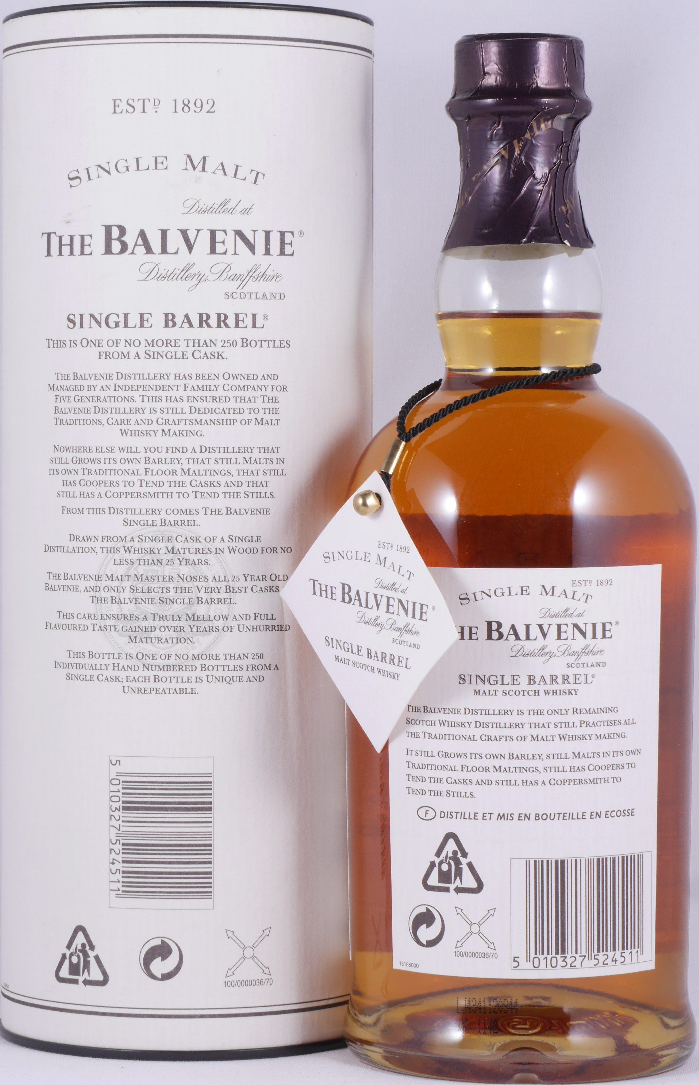 Der exquisite Vintage 1974 25 Years Balvenie Single Barrel Highland Single Malt Scotch Whisky wurde ohne Zusatz von Farbstoffen sowie Kühlfiltration abgefüllt und das Etikett wurde per Hand mit der Fassnummer, dem Bottling Date, In-Cask-Date sowie der individuellen Flaschen-Nummer versehen. Die nur begrenzt verfügbaren jährlichen Auflagen aus der Balvenie Single Barrel Limited Edition weisen eine außerordentliche Qualität auf, sind meist binnen kurzer Zeit ausverkauft und insbesondere die alten Abfüllungen aus den 1970er und 1980er Jahren gelten unter Kennern sowie Sammlern inzwischen als begehrte Sammler-Raritäten und sind nur noch selten zu finden.