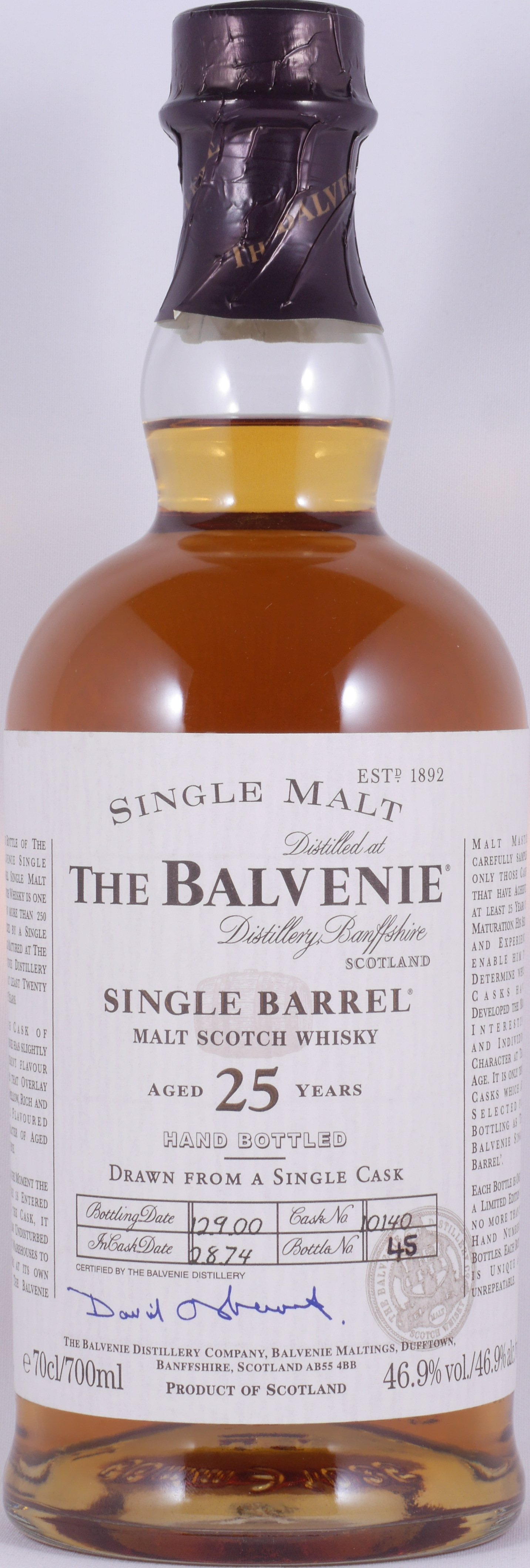 Ein seltener und wundervoller Vintage 1974 25 Jahre alter Balvenie Single Barrel Highland Single Malt Whisky, der am 2. August 1974 destilliert und nach 25 Jahren Reifung in einem Traditional Oak Cask mit der Cask No. 10140 von Balvenie Malt Master David Stewart persönlich ausgesucht und am 12. September 2000 in einer Auflage von 250 einzeln von Hand nummerierten Flaschen vermutlich für den französischen Markt mit 46,9% Vol. abgefüllt wurde.