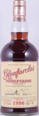 Ein seltener und wundervoller Vintage 1990 30 Jahre alter Glenfarclas Highland Single Malt Scotch Whisky aus der Glenfarclas The Family Casks Summer 2020 Single Cask Serie und spezielle Abfüllung von einem ausgesuchten First Fill Sherry Butt. Hierfür wurden bei Glenfarclas ein ausgewähltes Sherry Butt mit der Cask Nr. 5122 im Jahr 1990 befüllt, das Destillat durfte 30 Jahre im Fass reifen und wurde in einer Auflage von nur 545 Flaschen am 6. Juni 2020 ohne Zusatz von Farbstoffen und Kühlfiltration in Cask Strength mit 55,2% Vol. als limitierte Sommerr-Release S20 abgefüllt.