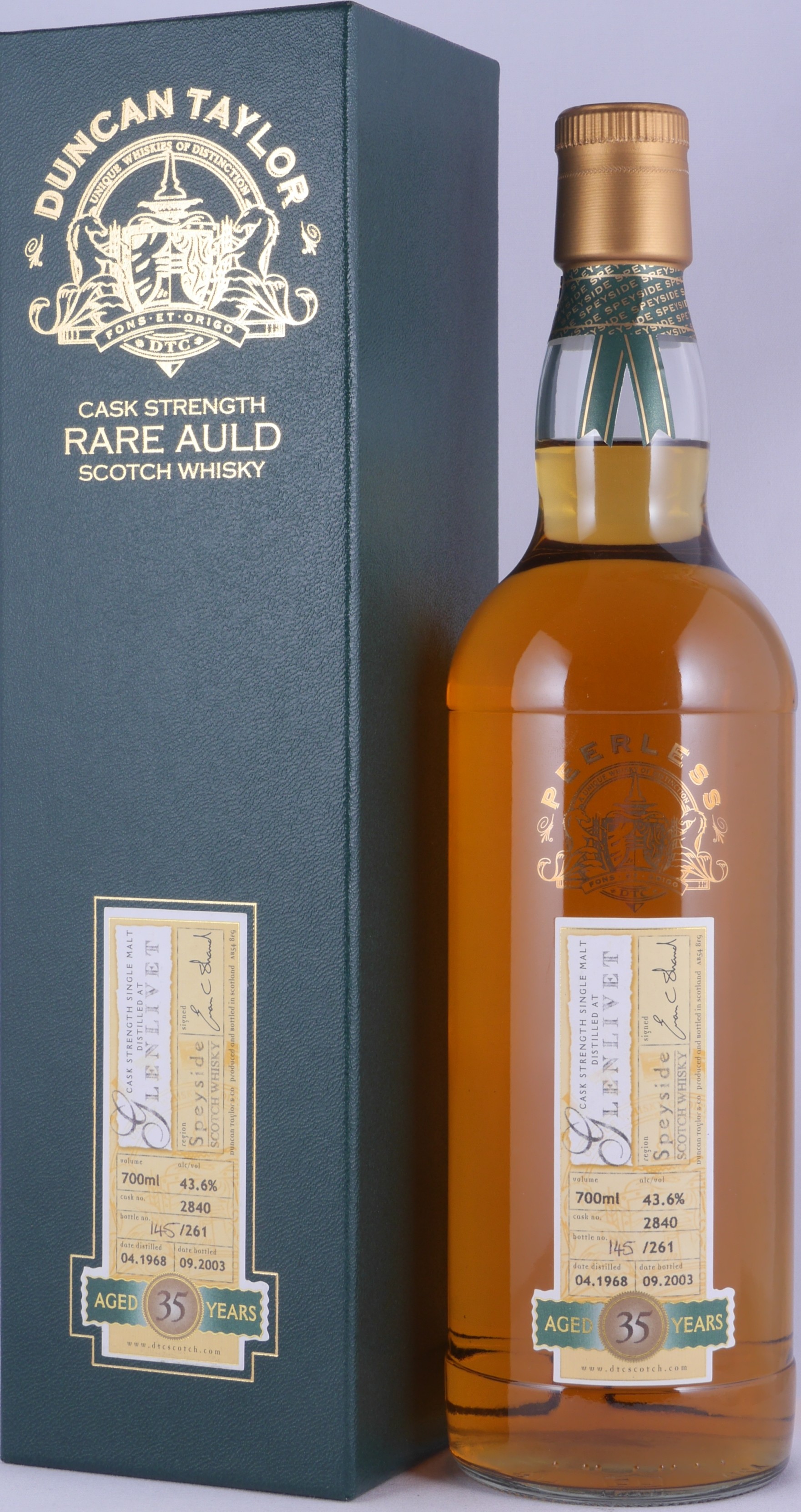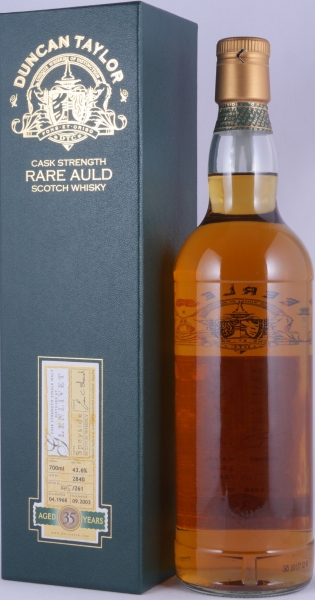 A very rare vintage 1968 35 year old Glenlivet Speyside Single Malt Scotch Whisky from the famous Cask Strength Rare Auld Limited Edition by Duncan Taylor, distilled in April 1968 and bottled after more than 35 years of maturation in an oak cask with the cask no. 2840 in January September 2003 without added colouring and chill filtration at cask strength 43.6% vol. in an edition of only 261 individually hand-numbered bottles. This great 35-year-old Glenlivet Speyside Single Malt Scotch Whisky from the late 1960s has a beautiful amber colour and delights with its maturity and complexity.