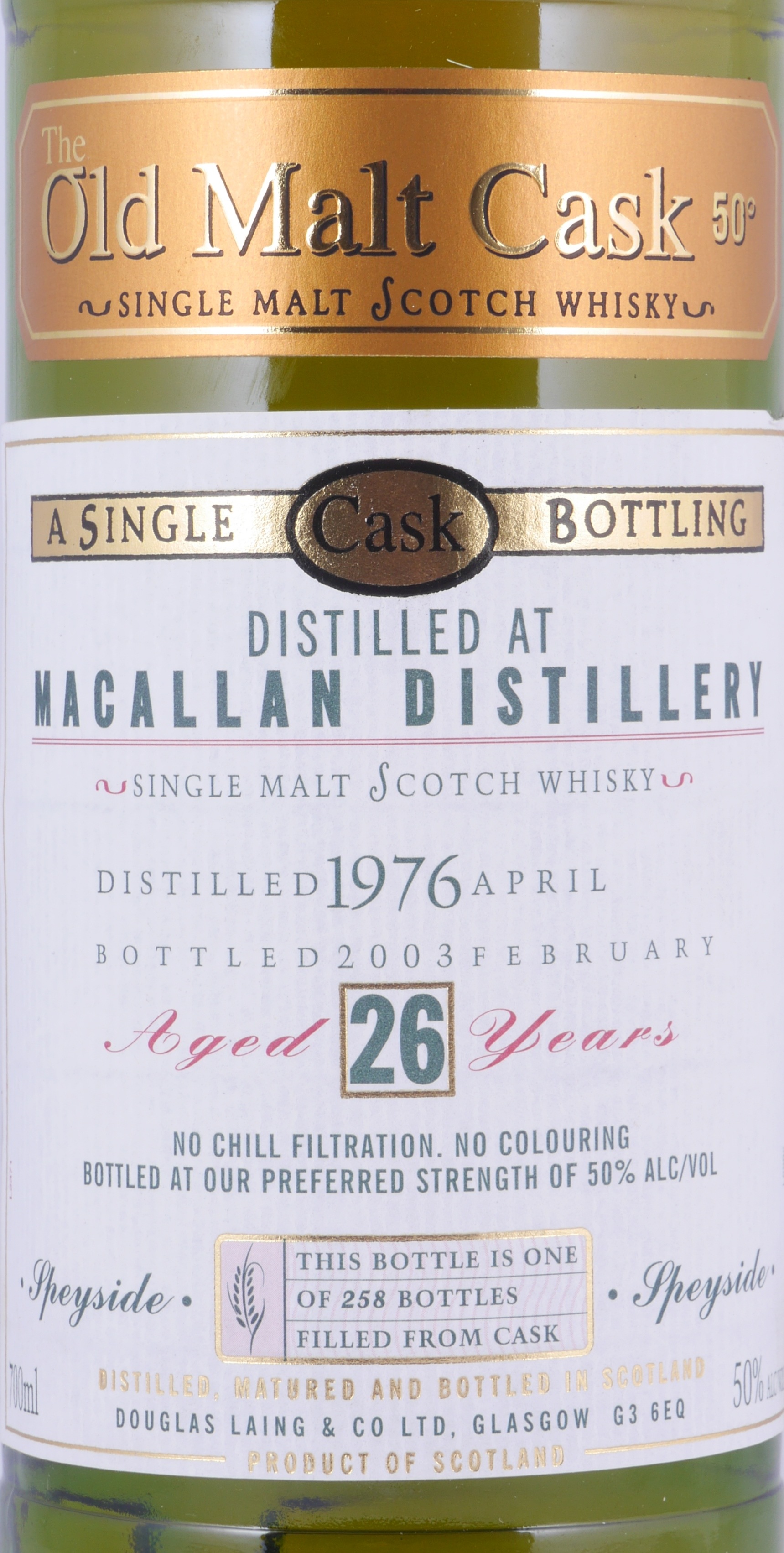 Ein besonders seltener und großartiger Vintage 1976 26 Jahre alter Macallan Highland Single Malt Scotch Whisky, der im April 1976 destilliert und nach über 26 Jahren Reifung in einem Oak Cask im Februar 2003 ohne Zusatz von Farbstoffen und Kühlfiltration in einer limitierten Auflage von nur 258 Flaschen von Douglas Laing in der Old Malt Cask Single Cask Bottling Serie mit 50,0% Vol. abgefüllt wurde.