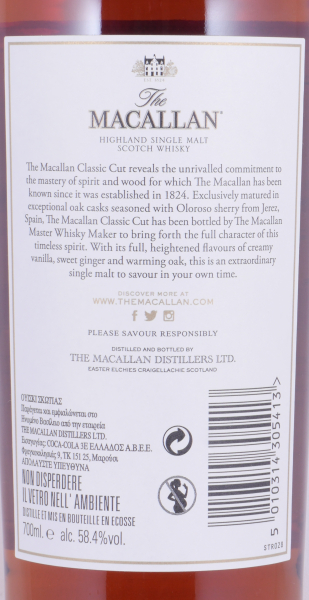 Der großartige Macallan Classic Cut Limited Edition 2017 Highland Single Malt Scotch Whisky ist die 1. Release aus der seit dem Jahr 2017 jährlich veröffentlichten Classic Cut Serie, reifte in erlesenen Oloroso Sherry Seasoned Oak Casks aus dem spanischen Jerez und wurde im Jahr 2017 in einer limitierten Auflage ohne Zusatz von Farbstoffen in Cask Strength mit 58,4% Vol. abgefüllt.