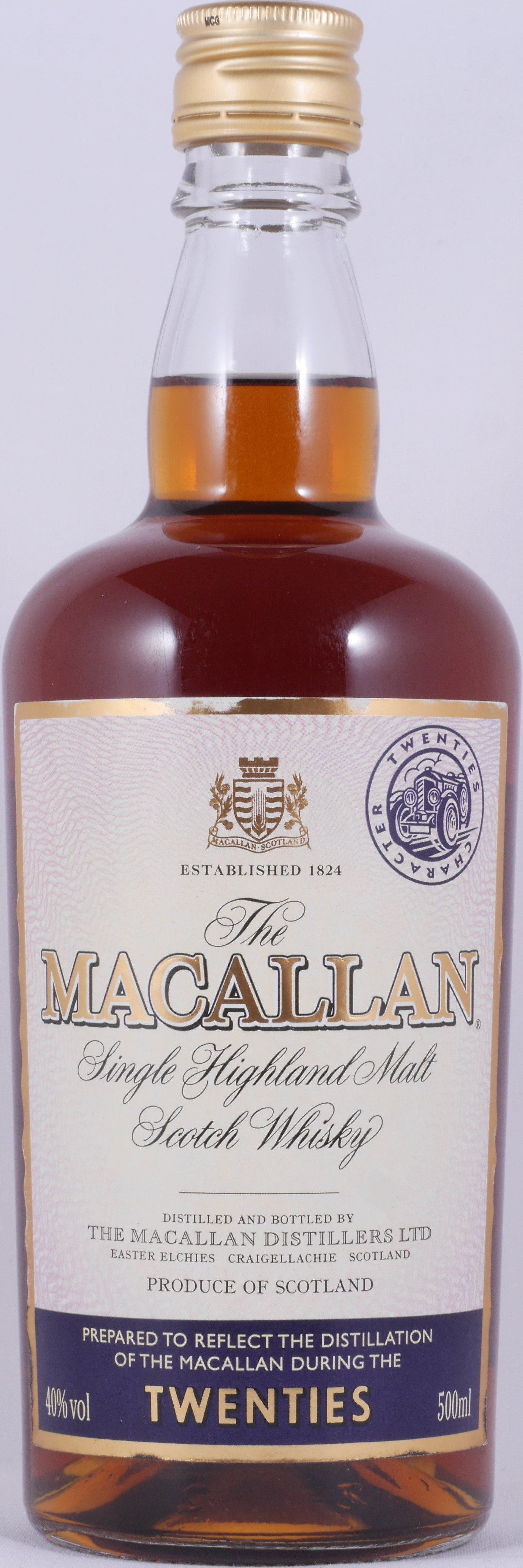 Mit dem Macallan Twenties 1920s Travel Range Highland Single Malt Scotch Whisky wurde von Macallan der Stil ihrer Whiskies aus den 1920er Jahren nachempfunden und von 1999 bis 2001 exklusiv in limitierter Auflage über den weltweiten Travel Retail Markt verkauft. Die frühen Abfüllungen aus der Macallan Travel Range Serie wurden im Jahr 1999-2000 mit der zu dieser Zeit ungewöhnlichen goldenen Screw Cap mit 40% Vol und 500ml abgefüllt.