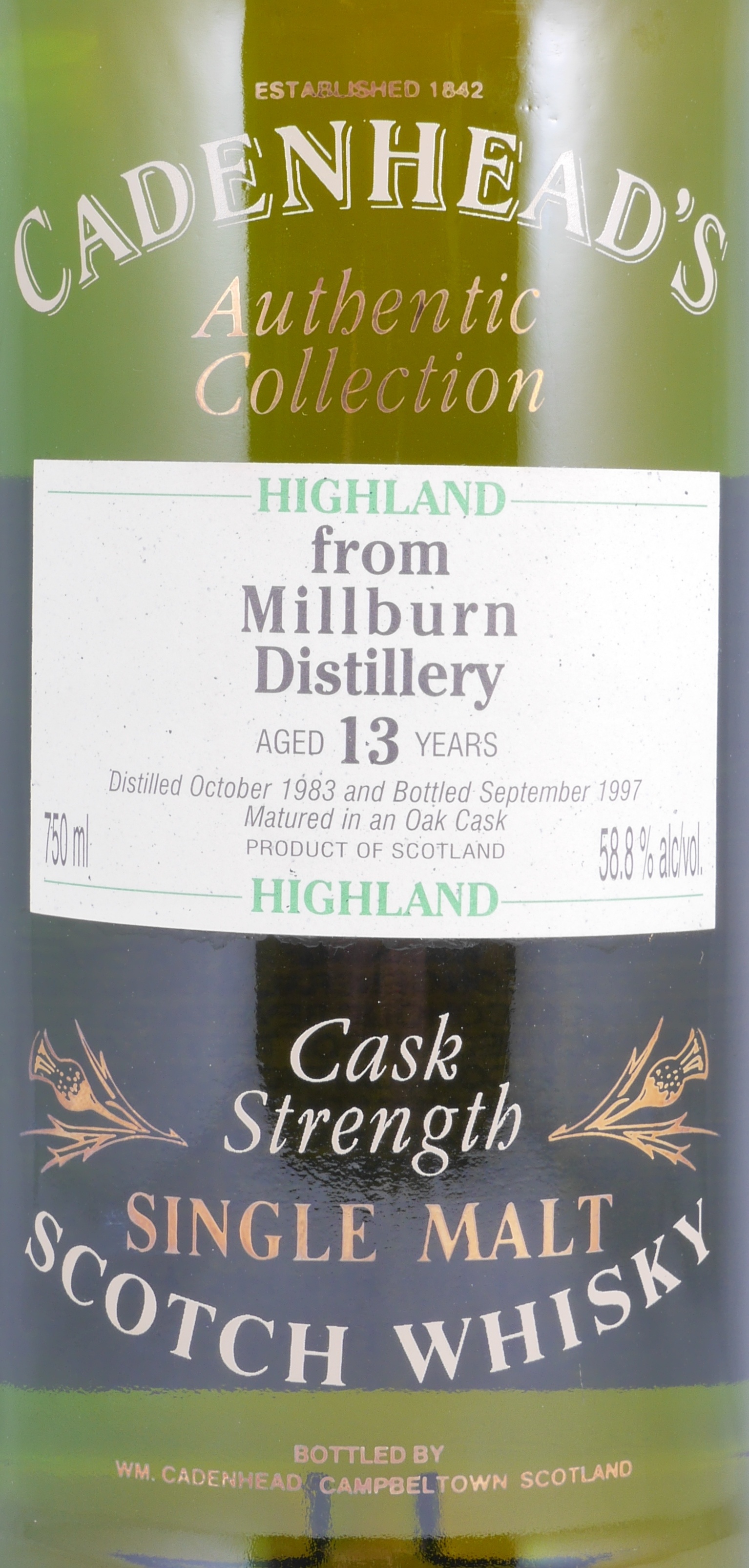 Ein besonders seltener Vintage 1983 13 Jahre alter Highland Single Malt Scotch Whisky aus der closed Destillerie Millburn, der im Oktober 1983 destilliert und nach über 13 Jahren Reifung in einem Bourbon Cask im September 1997 ohne Zusatz von Farbstoffen und Kühlfiltration in einer limitierten Auflage von WM. Cadenhead in der Authentic Collection Limited Single Cask Bottling Serie in Cask Strength mit 58,8% Vol. als US-Version mit 750ml für den weltbekannten Importeur Preiss Imports in Kalifornien abgefüllt wurde.