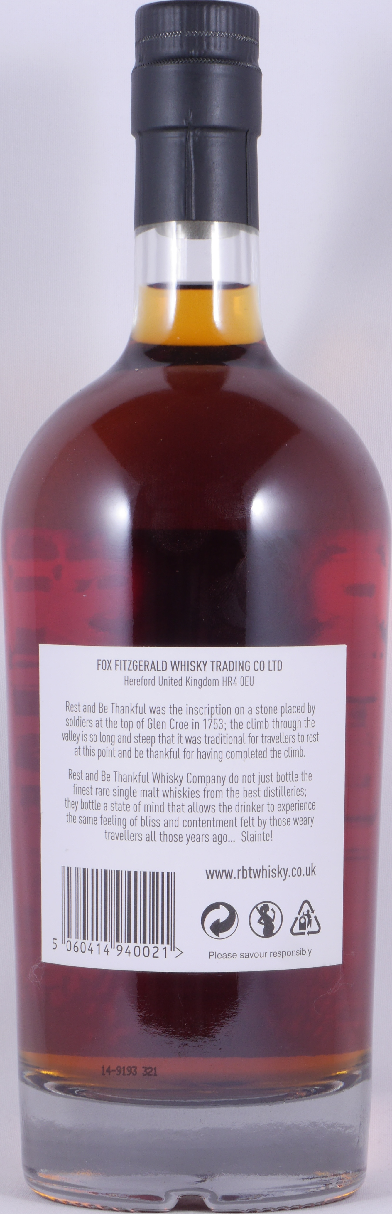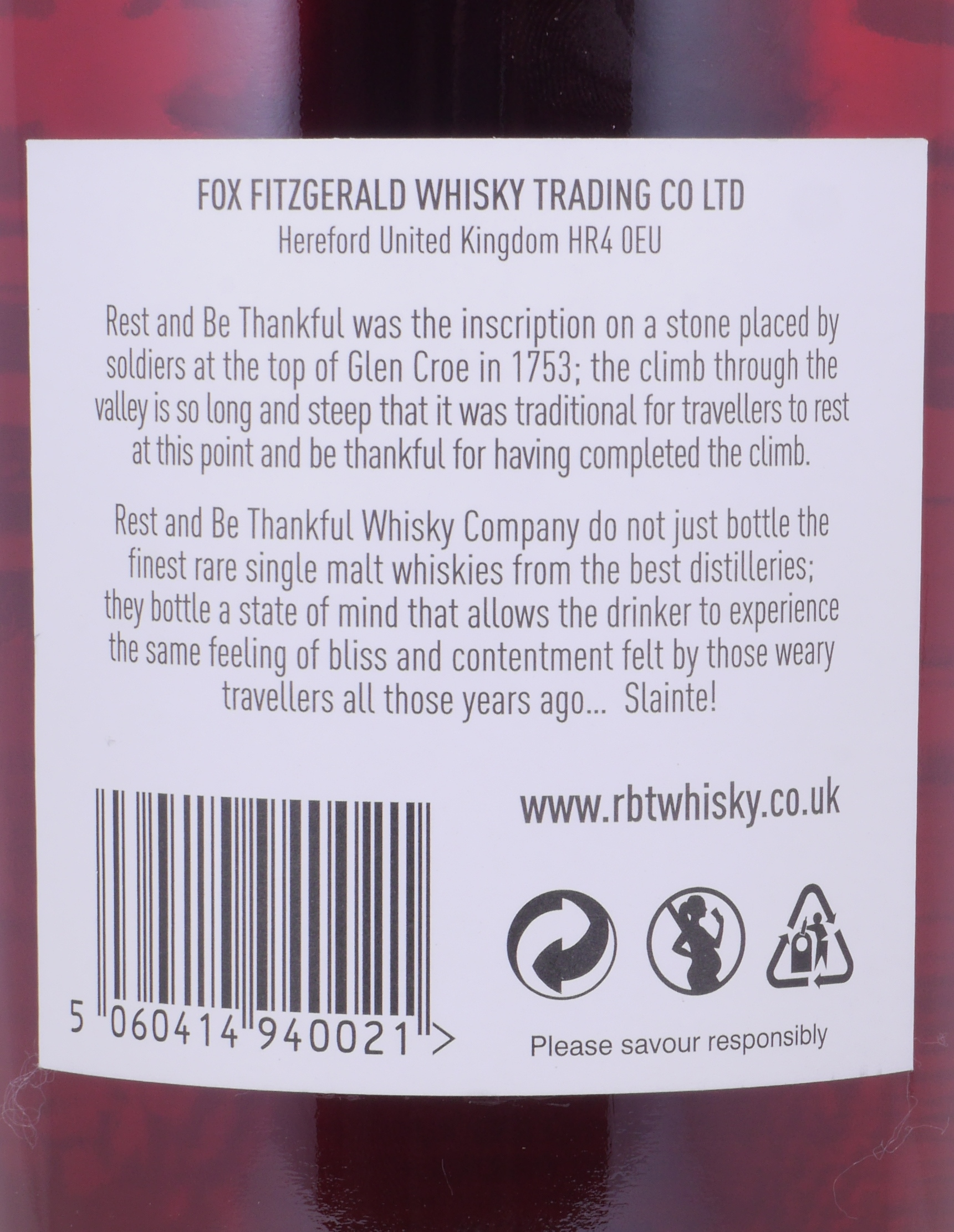 Die Rest and Be Thankful Whisky Company ist ein unabhängiger Abfüller von Single Malt Scotch Whisky sowie exquisitem Rum, wurde von Fox Fitzgerald Whisky Trading Company Ltd. gegründet und vertrat bis zum Verkauf im Jahr 2012 offiziell die Bruichladdich Destillerie und ist unter Kennern und Liebhabern weltweit bekannt für seine erlesenen und exquisiten Single Cask Abfüllungen. Der Name des Unternehmens stammt von einem berühmten Aussichtspunkt in Schottland und Rest and be Thankful ist eine Inschrift, die auf einem Stein am Ende eines anstrengenden Wanderwegs durch das schottische Glen Croe zu finden ist. Die Inschrift ist eine historische Redewendung, die Reisende nach der Anstrengung des Aufstiegs dazu aufforderte, sich auszuruhen und dankbar für die wundervolle Aussicht zu sein.