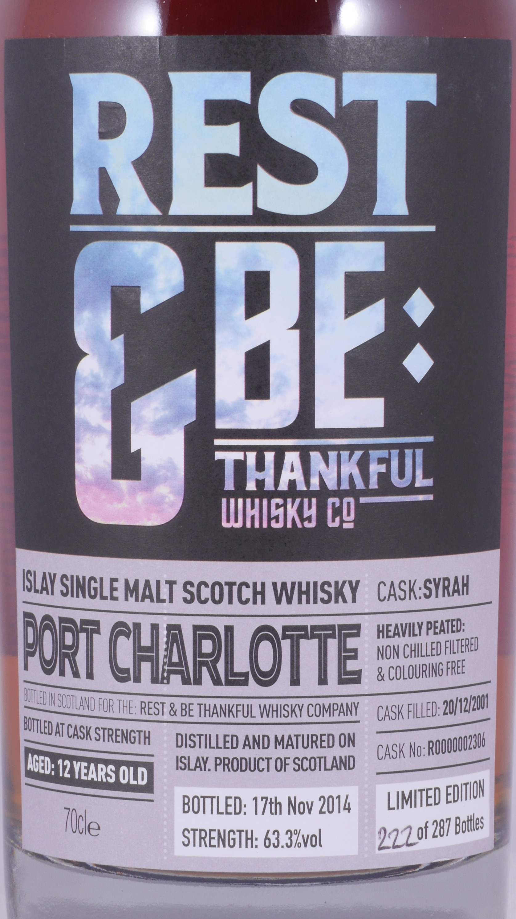 Ein seltener Vintage 2001 12 Jahre alter Bruichladdich Port Charlotte Heavily Peated Islay Single Malt Scotch Whisky von dem Independent Bottler Rest an Be Thankfull Whisky Company. Der spezielle Port Charlotte Islay Single Malt Scotch Whisky wurde am 20. Dezember 2001 destilliert und nach über 12 Jahren Reifung in einem Syrah Wein Cask mit der Cask Nr. R0000002306 am 17. November 2014 ohne Zusatz von Farbstoffen und Kühlfiltration in einer Auflage von nur 287 individuell von hand-nummierten Flaschen in Cask Strength mit 63,3% Vol. abgefüllt.