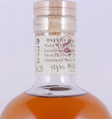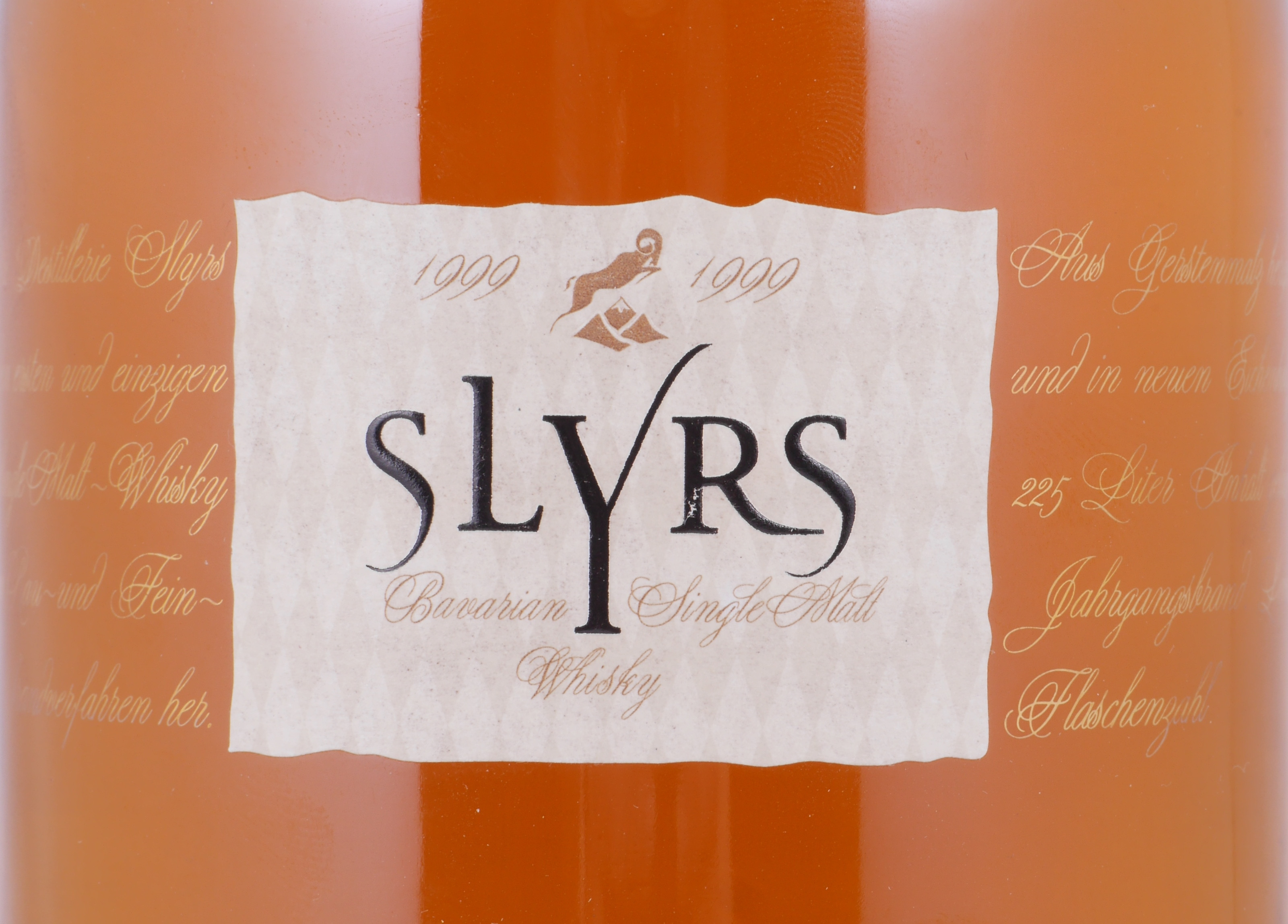 Die besonders seltene Erst-Abfüllung des Vintage 1999 Slyrs Bavarian Single Malt Whisky, der im Jahr 2002 nach 3 Jahren Reifung in neuen Holzfässern aus amerikanischer Weisseiche ohne Zusatz von Farbstoffen und Kühlfiltration in einer Auflage von 1600 individuell nummerierten Flaschen mit 43,0% Vol. abgefüllt wurde.
