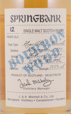 Ein seltener Vintage 1991 12 Jahre alter Springbank Campbeltown Single Malt Scotch Whisky aus der limited Wood Expressions Edition und dem Jahr 2004. Der Vintage 1991 12 Years Springbank Bourbon Wood Campbeltown Single Malt Scotch Whisky wurde im Dezember 1991 destilliert, durfte dann über 12 Jahre in ausgesuchten Bourbon Hogsheads und Barrels in den alten Springbank Warehouses reifen, bevor er im Februar 2004 ohne Zusatz von Farbstoffen und Kühlfiltration in Cask Strength mit 58,5% Vol. in einer Auflage von 5986 Flaschen abgefüllt wurde.