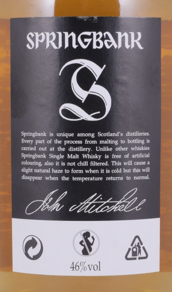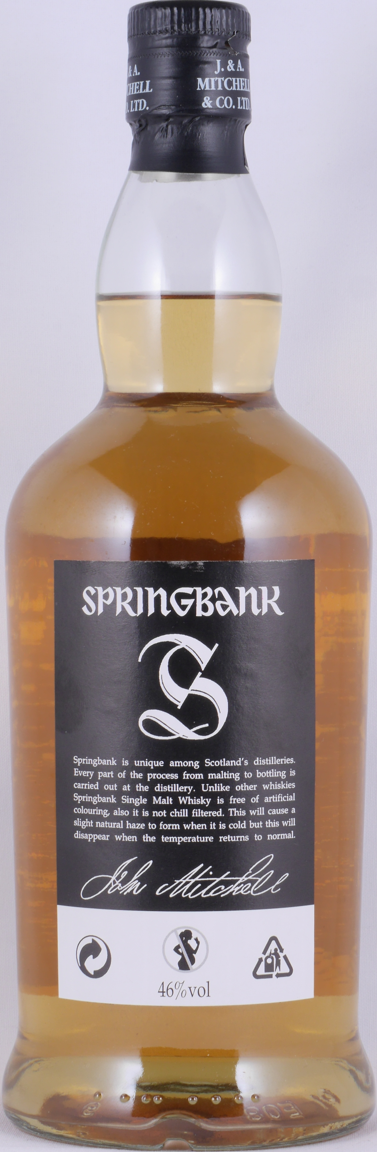 Ein seltener Springbank CV Campbeltown Single Malt Scotch Whisky, der aus unterschiedlich alten Malts zusammengestellte wurde und ohne Zusatz von Farbstoffen sowie Kühlfiltration im Jahr 2011 mit 46,0% Vol. im in limitierter Auflage mit dem alten Black Label abgefüllt wurde.