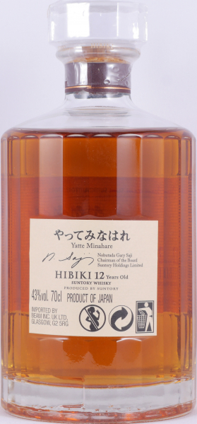 Der 12 Years Suntory Hibiki Japan Blended Whisky besticht im Geschmack mit seinen weichen Aromen, ist mild und frisch mit etwas Tannin, Sherry, Zitrus, Limone sowie Grapefruit, wurde auf der International Spirits Challenge 2010 mit der Gold-Medaille ausgezeichnet. Die 24 Facetten der Flasche symbolisieren die 24 Jahreszeiten, die man aus der uralten Tradition des Sekki kennt, dem alten japanischen Kalender.