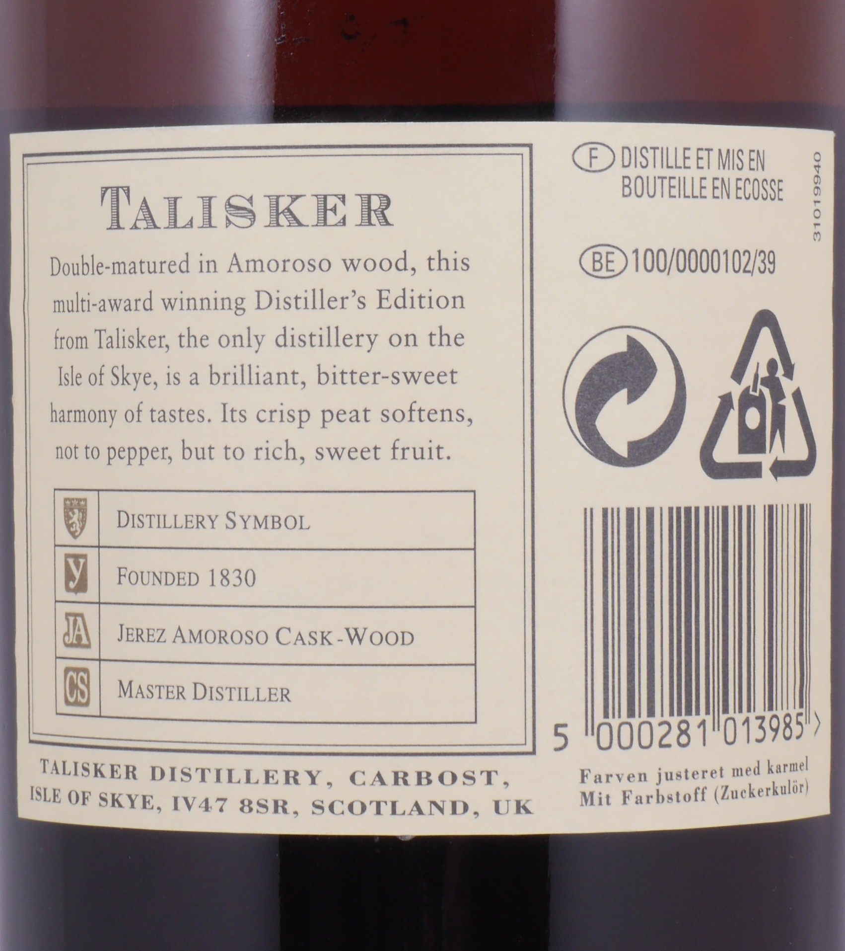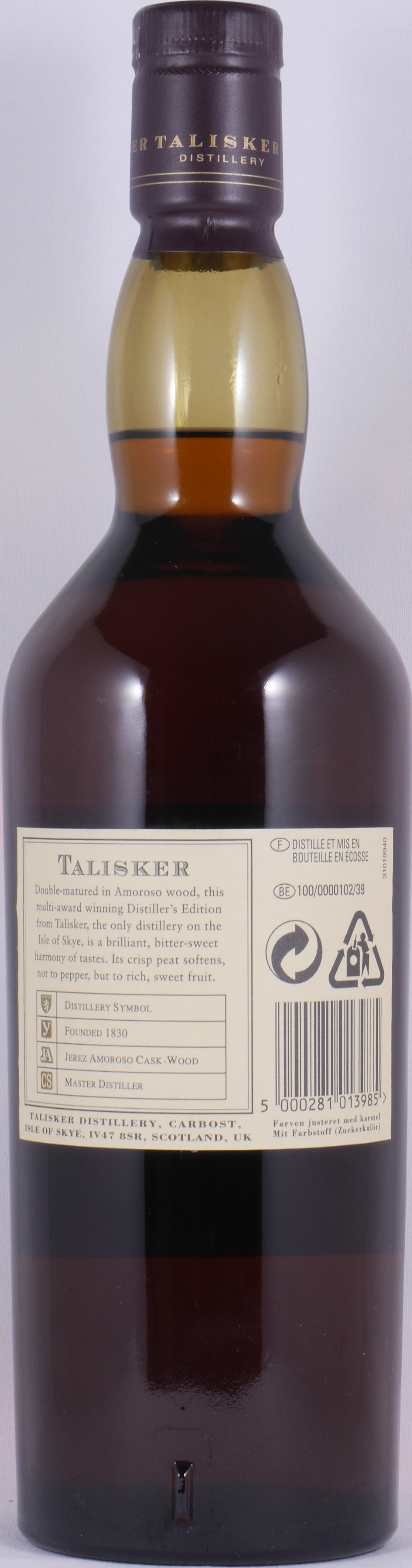 - Lebensmittelhersteller/Importeur: Talisker Distillery, Carbost, Isle of Skye IV47 8SR, Scotland