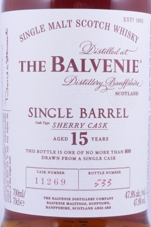 Balvenie 2001 15 Years Single Barrel European Oak Sherry Butt No. 11269 Highland Single Malt Scotch Whisky 47,8% Vol. - eine von 800 Flaschen eines besonderen Balvenie Highland Single Malt!