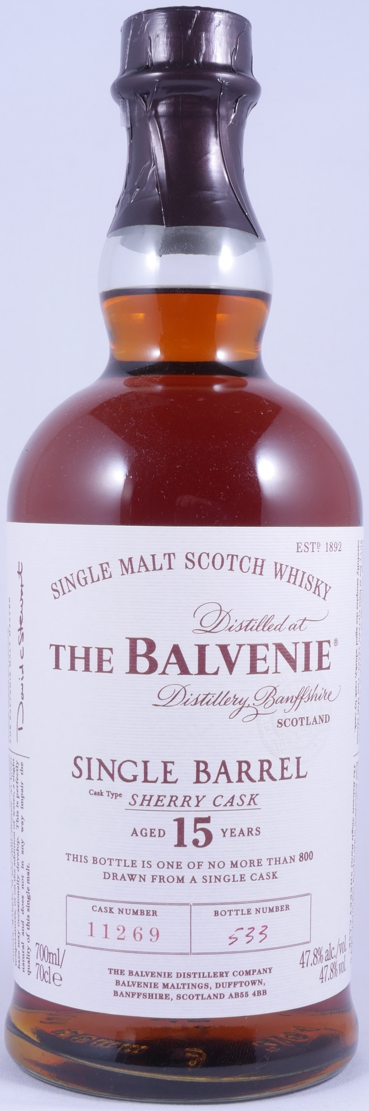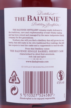 Der Vintage 2001 15 Jahre alte Balvenie Single Barrel Sherry Cask No. 11269 Highland Single Malt Scotch Whisky durfte 15 Jahre in einem European Oak Oloroso Sherry Butt mit der Cask Nr. 11269 reifen, wurde von dem Balvenie Malt Master David Stewart persönlich ausgesucht und am 5. Juli 2016 in einer Auflage von 800 individuell von Hand nummerierten Flaschen ohne Zusatz von Farbstoffen und Kühlfiltration mit 47,8% Vol. abgefüllt.