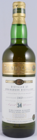 A very rare and epic vintage 1969 34 year old Springbank Campbeltown Single Malt Scotch Whisky, distilled in 1969 and bottled after 34 years maturation in an oak cask in the year 2002 without added colouring or chill filtration at cask strength 40.9% vol. in a limited edition of only 196 bottles by Douglas Laing in the Old Malt Cask single cask bottling series.