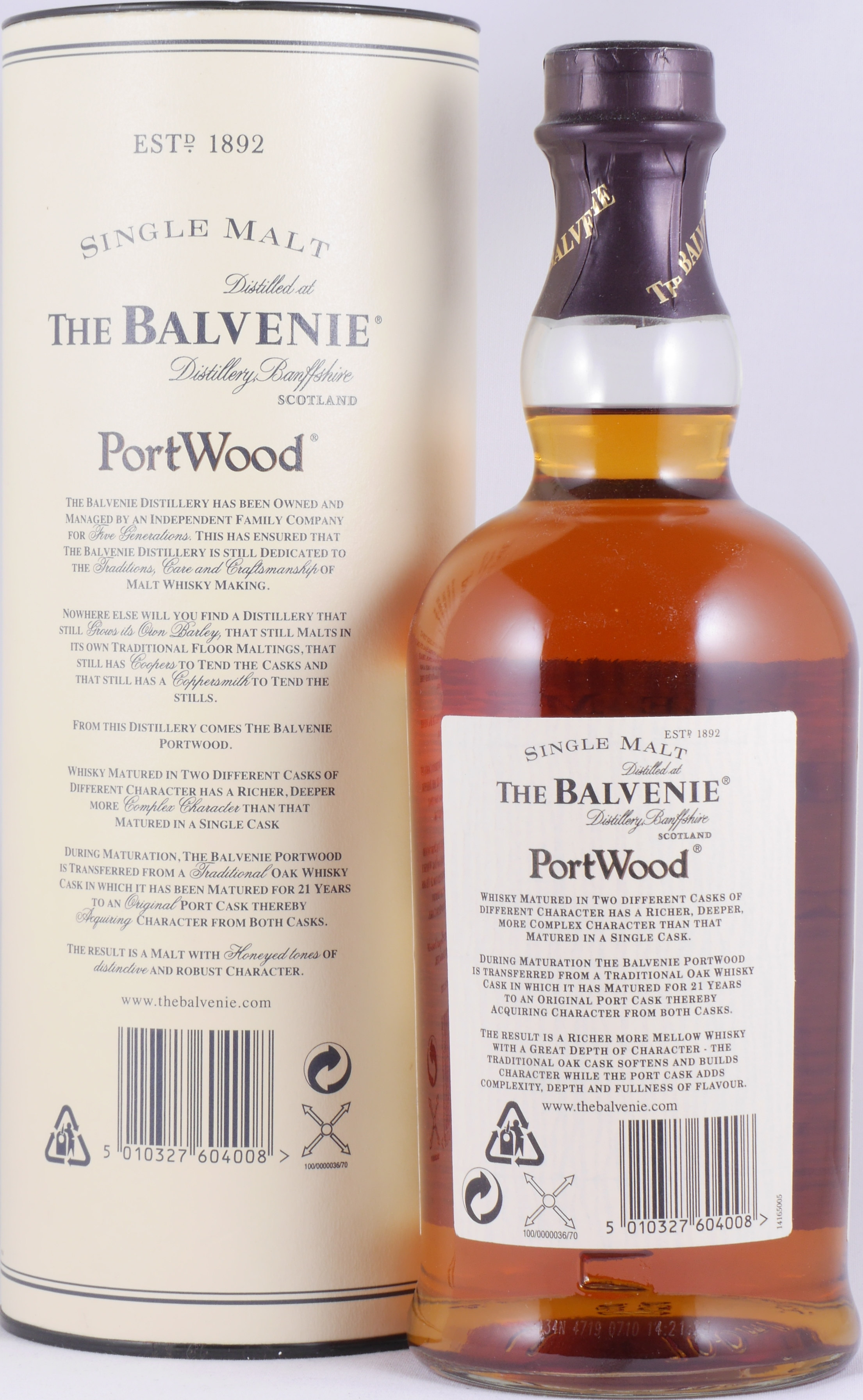 This exquisite 21 Years Balvenie PortWood Highland Single Malt Scotch whisky is sweet on the nose with fine smoke, wax, sultanas, nuts and spices, the flavour is complex, creamy sweet and spicy with honey, caramel, malt, marzipan, fine port and old wood, the finish is long and smooth with honey, oak and nuts - a complex and fine Balvenie Port Wood Highland Single Malt Scotch whisky with great body in exceptional quality and a worthy representative of the popular Port Wood series from Balvenie.A rich and complex 21 years Balvenie PortWood Highland Single Malt Scotch whisky with a remarkable character, a long, smooth and nutty finish of exceptional quality and a worthy representative of Balvenie s popular PortWood series.
