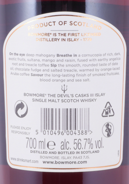 The rare 3rd release of Bowmore The Devils Casks III Limited Release Release1st Fill Oloroso and Pedro Ximénez Sherry Casks Islay Single Malt Scotch whisky was bottled in a limited edition without the addition of colouring and chill-filtration at cask strength with 56.7% vol. and was one of Bowmore s highly anticipated bottlings of the year 2015. Like the previous The Devils Cask Small Batch Release 1 and 2, this exceptional Bowmore Islay single malt Scotch whisky was matured in selected 1st fill Oloroso sherry and Pedro Ximénez sherry casks, has a dark mahogany colour and impresses with deep, juicy sherry aromas mixed with sweet peat and the intense Bowmore character.