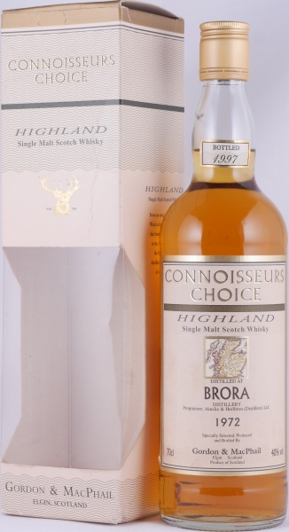 A very rare and terrific vintage 1972 25 years-old Brora Highland Single Malt Scotch Whisky at 40.0% vol. from the legendary Connoisseurs Choice range with the map label and gold screw cap from the independent bottler Gordon and MacPhail, which was bottled in the year 1997 in a limited edition. Among experts and connoisseurs, the 1972 vintage of Brora is considered legendary and a true whisky icon among the old bottlings from the closed Highland distillery Brora and is particularly rare and sought-after today!