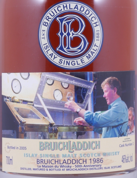 A rare vintage 1986 19 year old Bruichladdich Islay Single Malt Scotch Whisky, bottled after 19 years maturation in a 1st fill sherry butt with cask no. 2 exclusively for the 50th Anniversary of La Maison Du Whisky in the year 2005 without added colouring or chill filtration at 46.0% vol. in a limited edition of 690 individually numbered bottles.