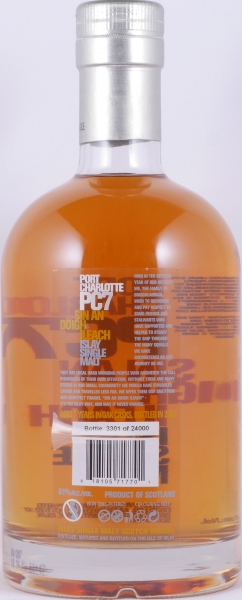 A rare vintage 2001 7 year-old Bruichladdich Port Charlotte PC7 Heavily Peated Islay Single Malt Scotch Whisky and the third release of the PC resp. Sin An Doigh Ileach bottling selected by master distiller Jim McEwan. The Port Charlotte PC7 Islay single malt Scotch whisky was distilled in the year 2001 and was bottled after 7 years of maturation in bourbon and sherry casks in October 2008 without the addition of dyes and chill filtration in a batch of 24.000 individually numbered bottles at cask strength 61.0% abv and 40 PPM.