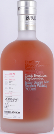 A rare vintage 2009 11 year old Bruichladdich Islay Single Malt Scotch whisky, distilled on 28th September 2009 with optic barley and bottled after 11 years of maturation in a special French 2nd fill Pauillac Bordeaux wine cask on 3rd November 2020 in the distillery Micro Provenance Single Cask Evolution Exploration series as a premium cask selection without the addition of colourants and chill filtration at cask strength 58.5% vol. exclusively for Weinhaus H. Hilgering in a limited edition of only 270 individually numbered bottles.