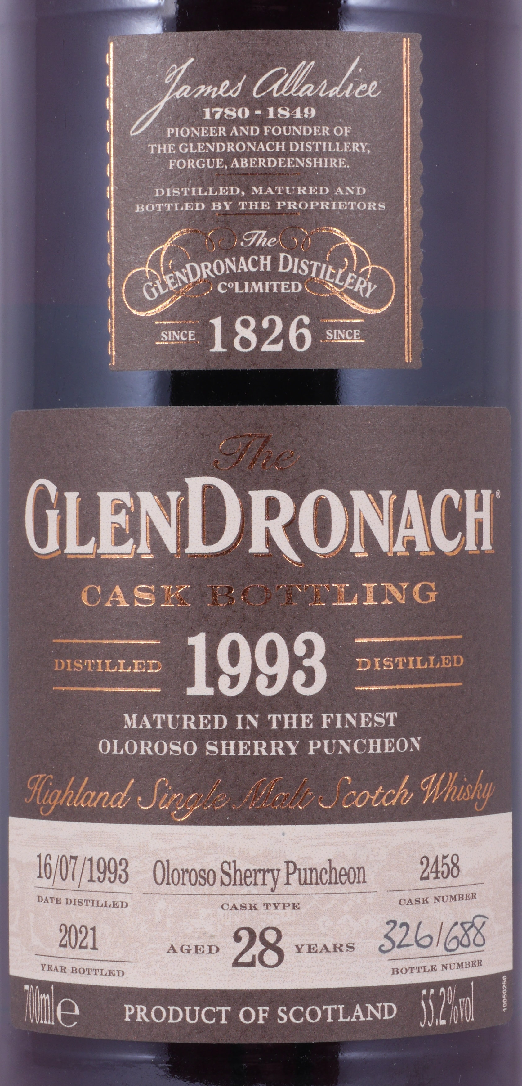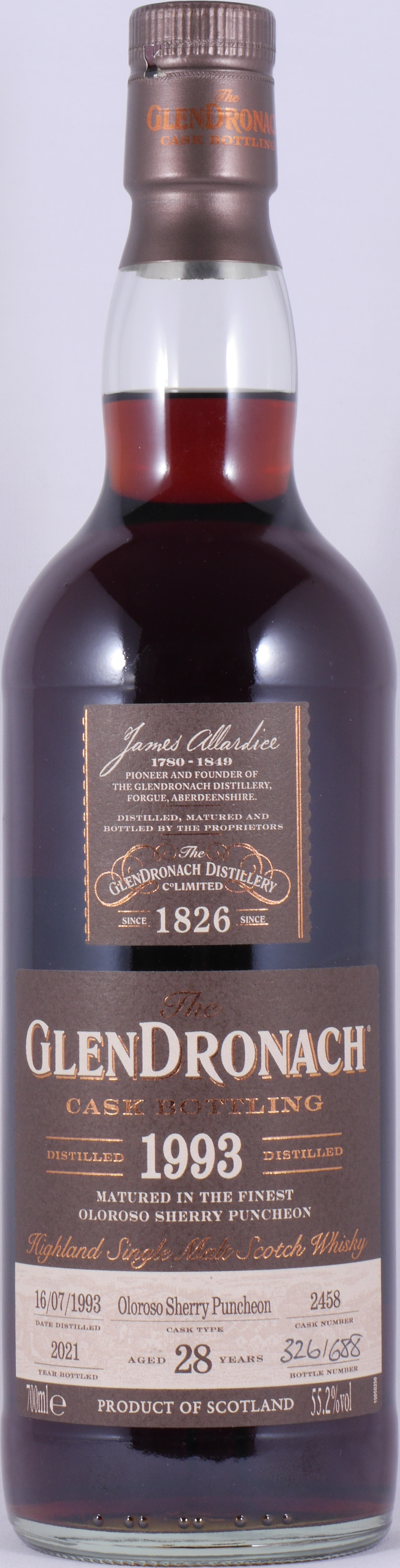 This rare and magnificent vintage 1993 28-year-old Glendronach Highland Single Malt Scotch Whisky was distilled on 16 July 1993, matured for over 28 years in an exquisite Oloroso sherry puncheon with cask no. 2458, and bottled in December 2021 in the Glendronach Single Cask Limited Release Batch No. 19 series without the addition of colourants or chill filtration at cask strength of 55.2% ABV in a limited edition of only 688 individually hand-numbered bottles.