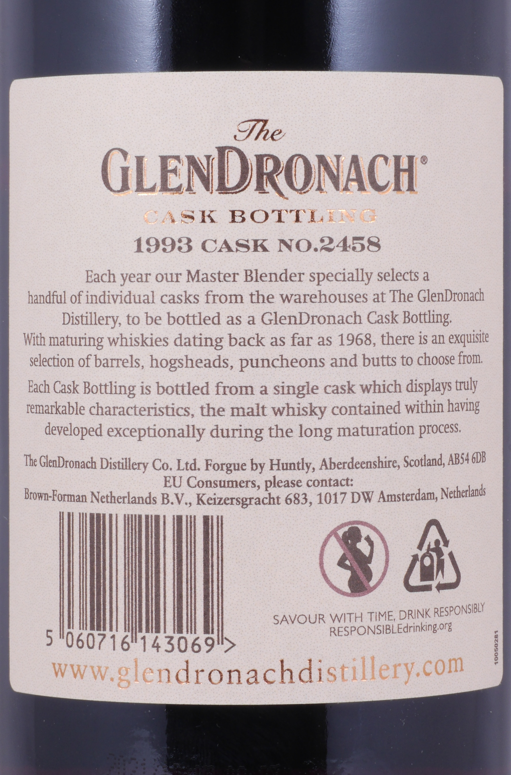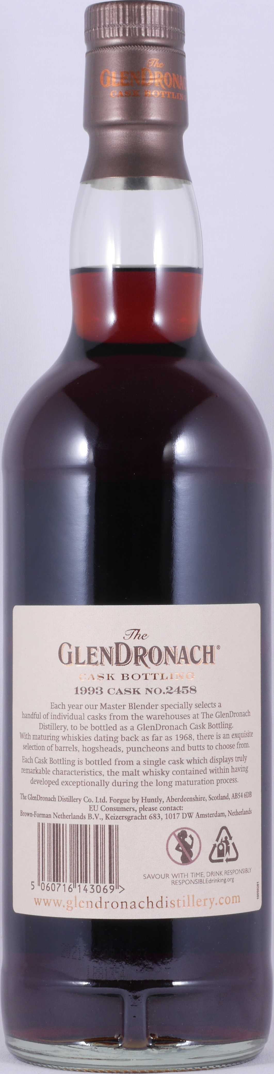 - Producer/Importer: The Glendronach Distillery Co. Ltd., Forgue by Huntly, Aberdeenshire AB54 6DB, Scotland / Brown-Forman Netherlands B.V., Keizersgracht 683, 1017 DW Amsterdam, Netherlands