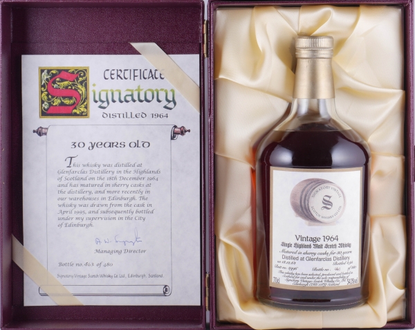 A very rare and stunning vintage 1964 30 year old Glenfarclas Highland single malt scotch whisky by Signatory Vintage for their limited rare reserve single caks range. This old and exquisite 30 years Glenfarclas Highland single malt was distilled on 18th December 1964, matured for 30 years in a sherry butt with cask no. 4996 and was bottled without the addition of dyes and chill filtration in April 1995 in a limited edition of only 480 individually numbered dumpy bottles at cask strength 54.1% vol.