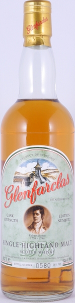 This rare and special vintage 1976 20 year old Glenfarclas Highland Single Malt Scotch Whisky is no. 2 in the special limited edition range for Robert Burns from the year 1996. The Glenfarclas Highland single malt was distilled in 1976, matured for 20 years in selected sherry casks and was bottled in the year 1996 without the addition of colourants and chill filtration in a limited edition of 1.200 individually numbered bottles at cask strength 52.6% vol.