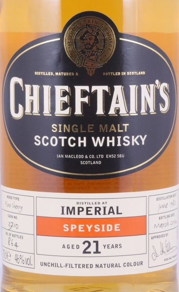 A rare vintage 1982 21 years-old Imperial Speyside Single Malt Scotch Whisky, distilled in June 1982 and bottled after over 21 years maturation in a fino sherry cask with cask no. 3710 in March 2004 in a limited edition of 864 bottles by the Independent Bottler Ian McLeod in the Chieftains Choice Limited Edition Single Cask Bottling Series without added dyes and chill filtration at 46.0% vol.