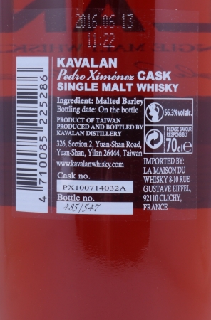 A rare vintage 2010 5 year old Kavalan Solist Taiwan Single Malt Whisky distilled on 24th July 2010 and bottled after over 5 years maturation in a selected Pedro Ximenez sherry cask with cask no.: PX100714032A on 13th June 2016 with no added colouring or chill filtration in an edition of 547 individually numbered bottles for La Maison du Whisky at cask strength at 56.3% vol.