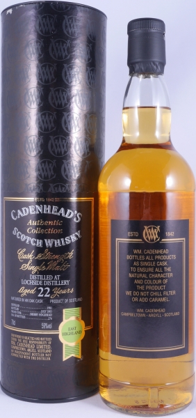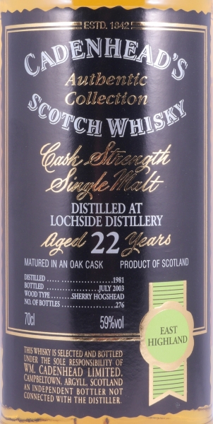 A rare vintage 1981 22-year-old Lochside Highland Single Malöt Scotch Whisky of the lost distillery Lochside, distilled in 1981 and after 22 years of maturation in a sherry hogshead bottled in July 2003 without the addition of dyes and chill filtration in a limited edition of only 276 bottles at cask strenght 59.0% abv by WM. Cadenhead in the Authentic Collection limited Single Cask Bottling Series.