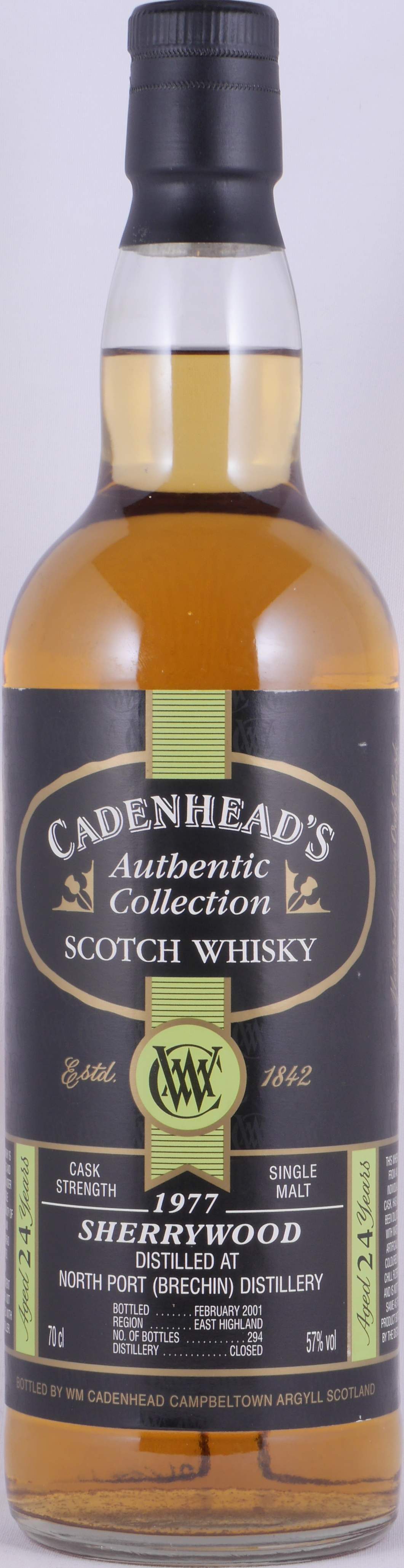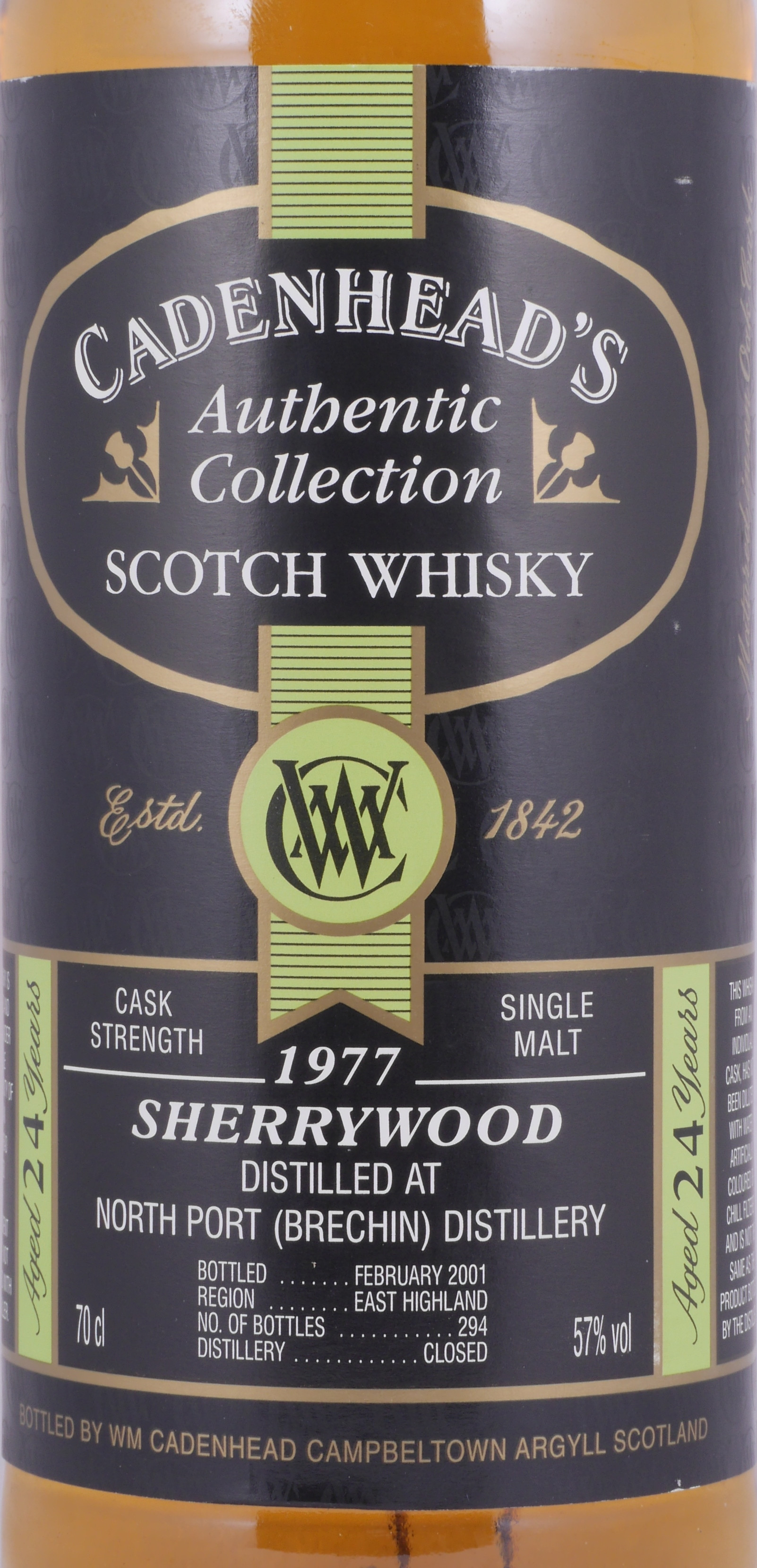 A very rare vintage 1977 24 years old Highland single malt Scotch whisky from the 1983 closed North Port distillery, distilled in 1977 and after 24 years of maturation in a sherry wood cask, bottled in February 2001 without added colouring or chill filtration in a limited edition of only 294 bottles by WM. Cadenhead in the Authentic Collection limited single cask bottling series at cask strenght 57.0% vol.