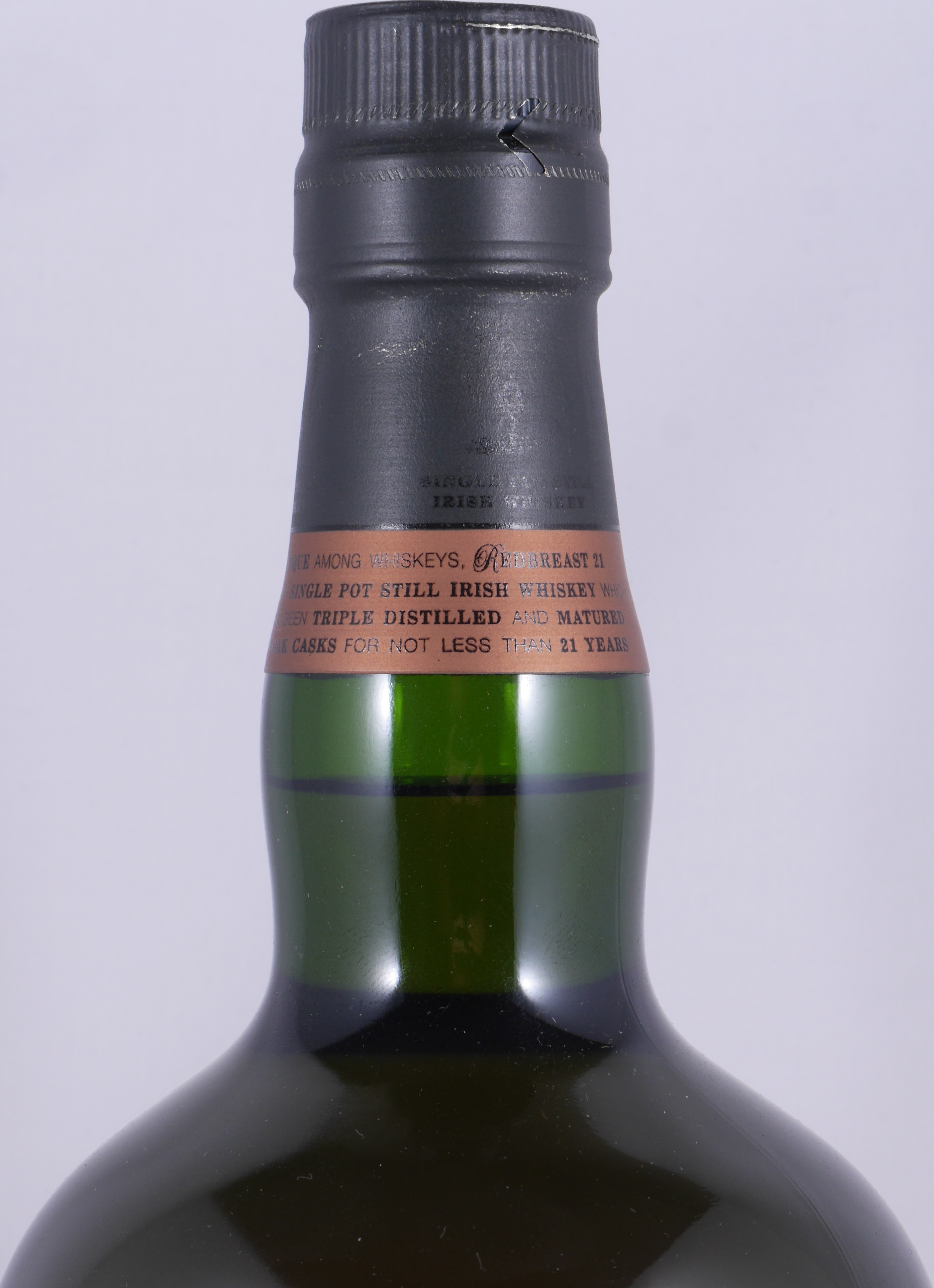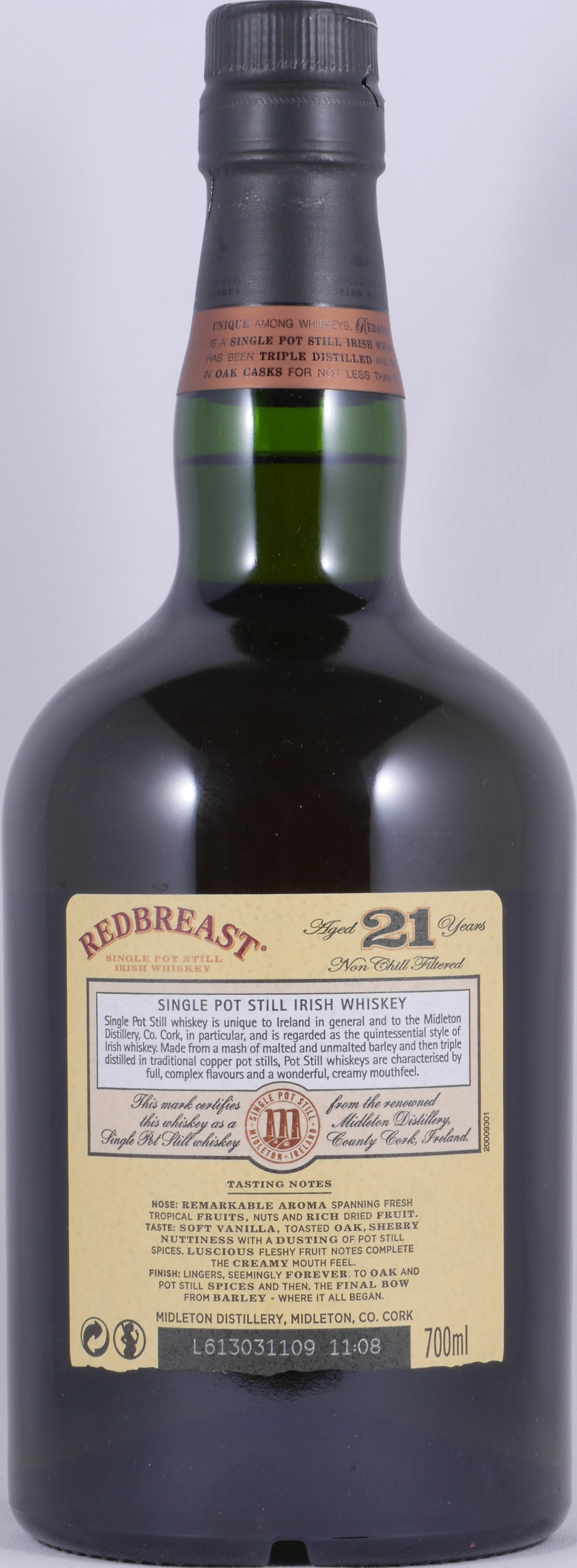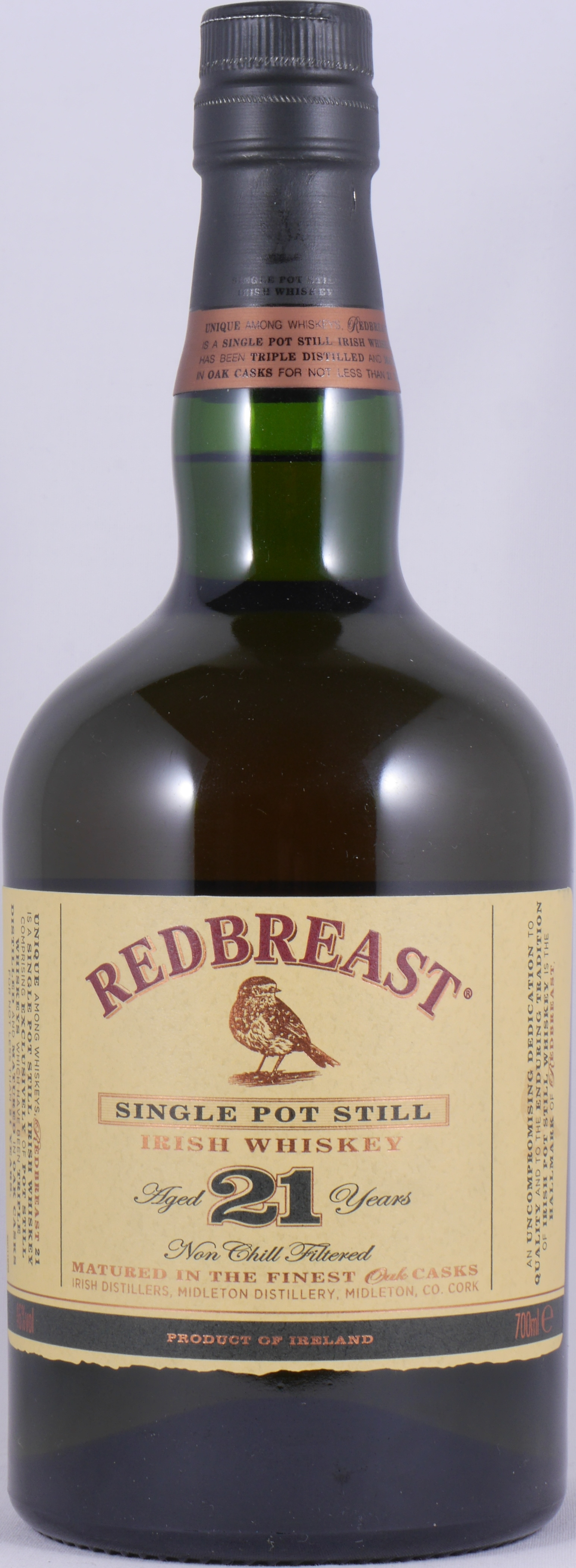 A rare 21-year-old Redbreast Single Pott Still Irish Whiskey from the Midleton Distillery, created by the master blender from the old stocks after 21 years of maturation in selected oak casks and bottled in the year 2016 without the addition of colourants and chill filtration at 46.0% ABV.