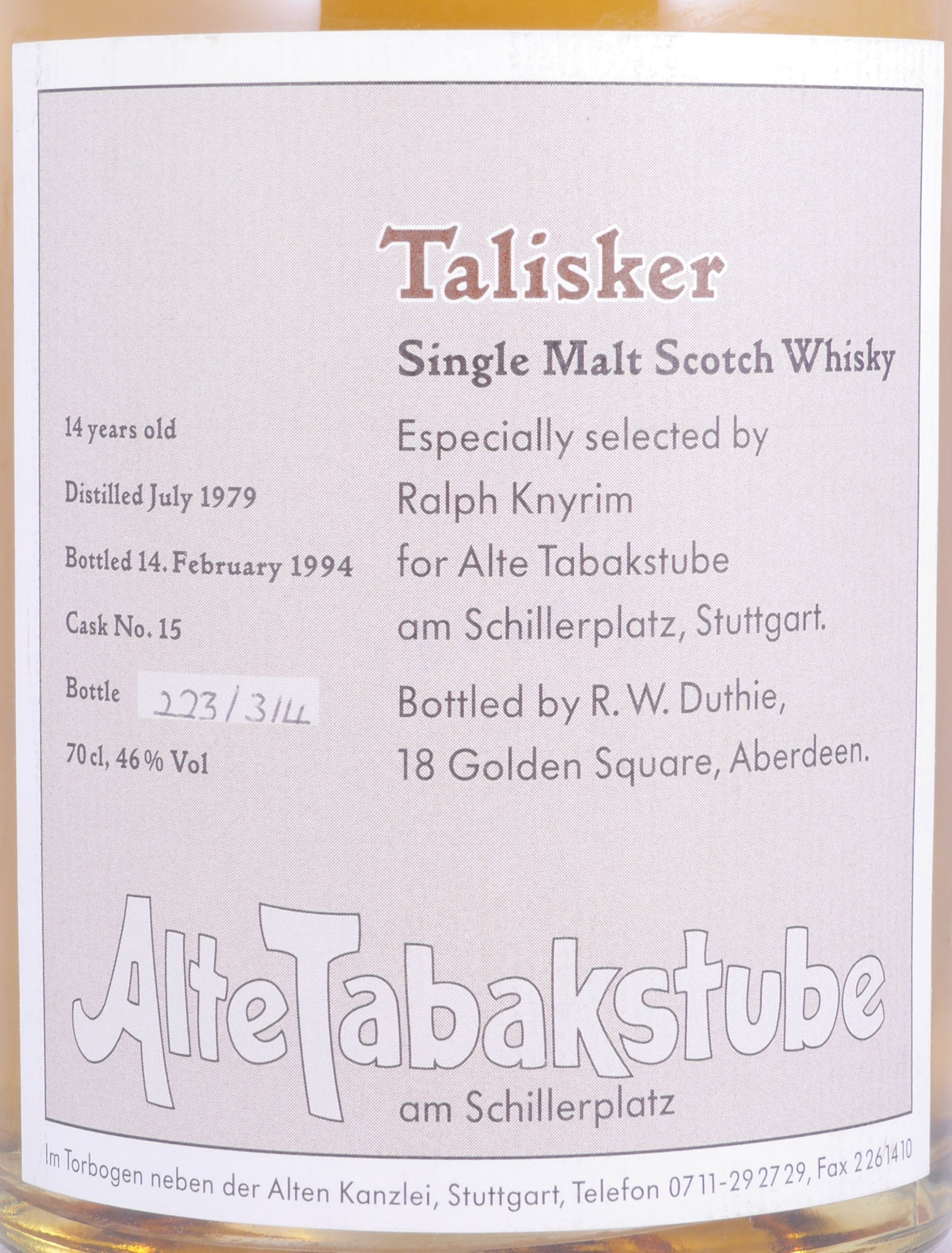 A very rare and stunning vintage 1979 14 year old Talisker Isle of Skye Single Malt Scotch whisky in the old dumpy bottle, distilled in July 1979 and bottled after more than 14 years of maturation in an oak cask with cask no. 15 by R.W. Duthie for the Alte Tabakstube at Schillerplatz in Stuttgart on 14th February 1994 without the addition of colourants and chill filtration in a limited edition of only individually numbered 314 bottles at 46.0% vol.