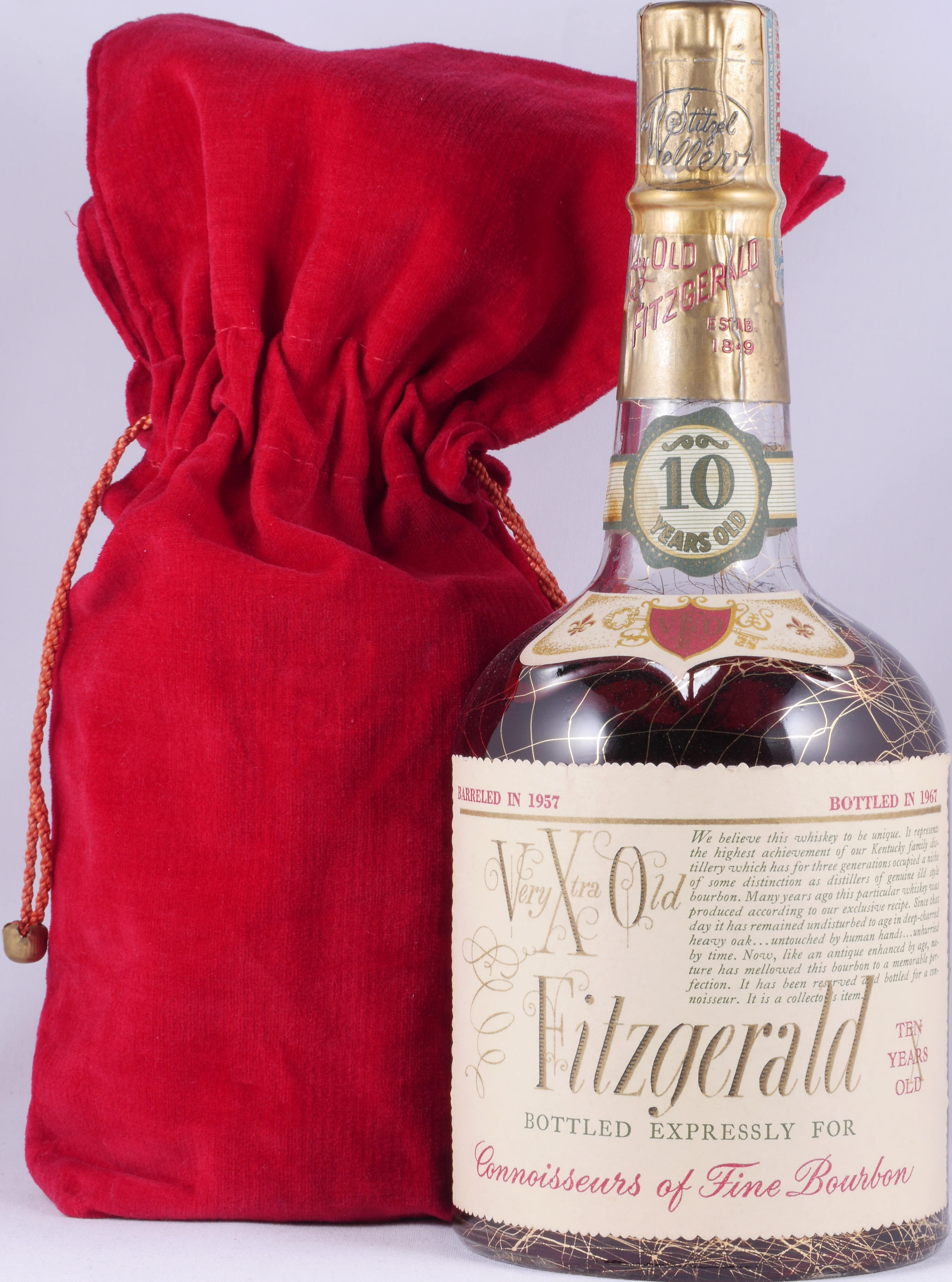 This extremely rare and highly collectible vintage 1957 10 year old Very Xtra Old Fitzgerald Bottled expressly for Connoisseurs of Fine Bourbon Kentucky Straight Bourbon Whiskey was bottled in the year 1967 by the world famous Stitzel Weller distillery in Louisville for the export market in a limited edition in the classic old 75cl / 4/5 quart dumpy bottle at 45.0% vol / 90 proof.